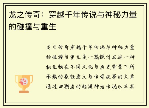 龙之传奇:穿越千年传说与神秘力量的碰撞与重生